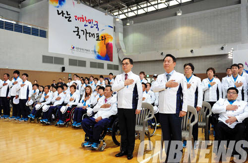 7일 경기도 이천훈련원에서 김종 문체부 제2차관, 김성일 대한장애인체육회 회장, 김락환 선수단장을 비롯한 선수단 600여 명이 참석한 가운데 ‘2014 인천장애인아시아경기대회 대한민국 선수단 결단식’행사가 열렸다.