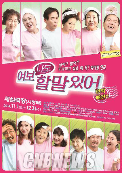 한편 연극 '여보 나도 할 말 있어'는 다음달 1일 시청역 세실극장에서 개막해 12월 31일까지 공연된다. 화, 목, 금요일엔 오후 8시, 수요일엔 오전 11시와 8시, 토요일엔 오후 3시와 7시, 일요일엔 오후 3시에 공연이 있다. 배우 장영주, 김정하, 손민형, 유형관, 전성애, 김선화, 김성기, 진수현, 이수미, 박현정, 손건우, 이승안, 권혜영이 출연한다. 포스코, (주)금호석유과학, 민들레영토, SK텔레콤, T멤버십초콜릿에서 후원한다.
