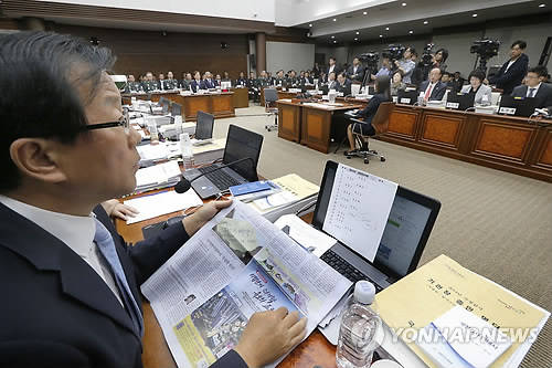▲8일 용산구 국방부에서 열린 국회 국방위원회의 국군기무사령부 등에 대한 국정감사에서 새정치민주연합 윤후덕 의원이 새누리당 송용근 의원의 야당 의원 비하 메모와 관련해 발언을 하고 있다.(사진=연합뉴스)