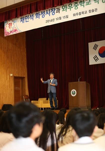 채인석 화성시장이 15일 와우중학교를 방문해 시정운영에 대한 경험과 인생 선배로서의 개인적 삶의 경험을 학생들에게 전달했다.