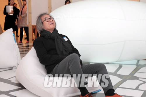 ▲17일 서울 동대문디자인플라자(DDP)에서 '서울, 공감의 도시건축'전 설명회가 열렸다. 이날 전시장에 설치된 작품을 승효상 건축가가 누워서 관람하고 있다.(사진=왕진오 기자)