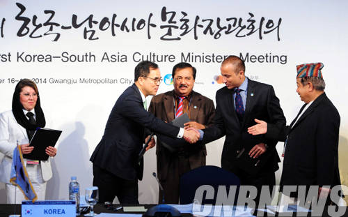 이날 김종 문화체육관광부 제2차관이 남아시아 6개국 장, 차관들과 아시아문화전당을 통한 문화협력 강화를 담은 ‘광주 공동선언문’ 채택을 마친 뒤에 인사를 나누고 있다.