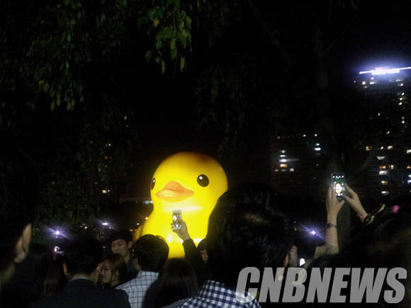 18일 밤 9시 서울 잠실 석촌호수 풍경. 러버덕을 보기 위해 찾아온 사람들로 밤에도 붐비고 있는 모습이 눈길을 끈다.