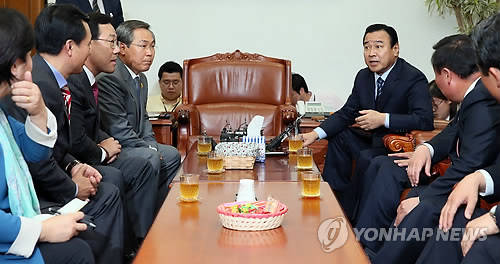 ▲새누리당 이완구 원내대표(오른쪽)와 새정치민주연합 우윤근 원내대표(왼쪽) 등 여야 원내 지도부가 14일 국회 운영위원장실에서 회동하고 있다.(자료사진=연합뉴스)