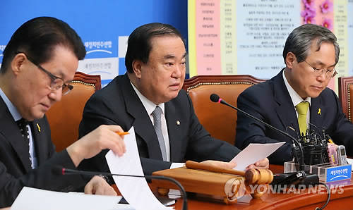 ▲새정치민주연합 문희상 비상대책위원장이 17일 국회에서 열린 확대간부회의에서 모두발언하고 있다. 왼쪽부터 박지원 비대위원, 문 위원장, 우윤근 원내대표.(사진=연합뉴스)