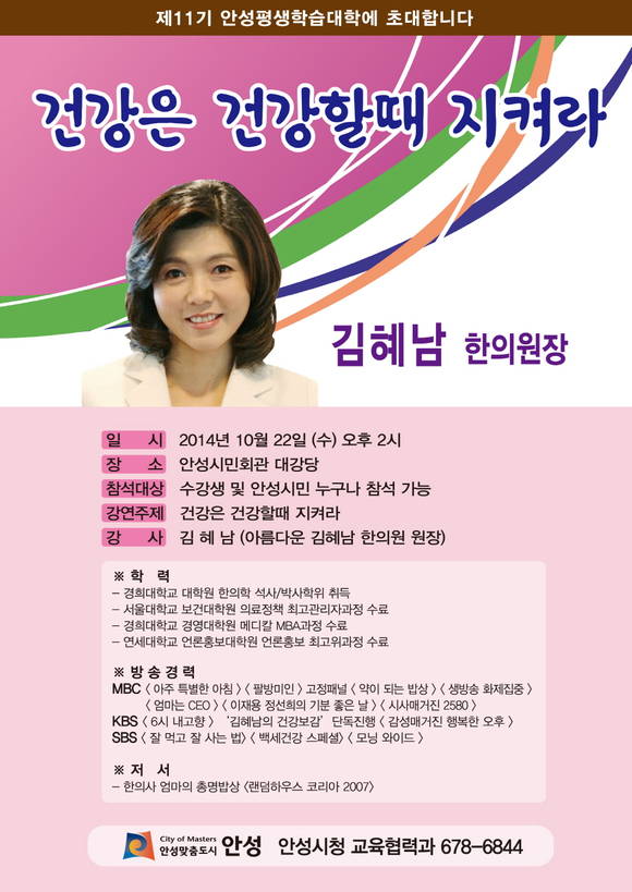 안성시(시장 황은성)는 오는 22일 오후 2시 시민회관에서 안성평생학습대학 8회차 강연으로 김혜남 한의원장을 초청해 ‘건강은 건강할 때 지켜라’ 라는 주제로 강연을 연다.