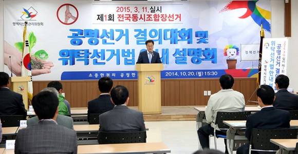 평택시선거관리위원회(위원장 유상재)는 2015년 3월 11일 실시하는 제1회 전국동시조합장선거를 맞이하여 20일 평택시선거관리위원회 대회의실에서 평택시 관내 7개 조합의 입후보예정자를 대상으로「공명선거 결의대회 및 위탁선거법 안내 설명회」행사를 개최하였다.