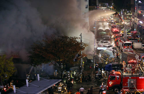 서울 종로5가 동대문종합시장 앞 원단상가에서 화재가 발생해 17개 점포가 불에 탔다. 낡은 목조건물인데다 LPG 가스가 누출되는 바람에 불길이 더욱 확산됐다. 다행히 영업시간 이후에 화재가 발생했고, 건물 안에 있던 사람들이 재빨리 대피해 인명피해는 없었다. 사진은 이날 화재현장에서 소방대원들이 진화작업을 하고 있는 모습. (사진 = 연합뉴스)
