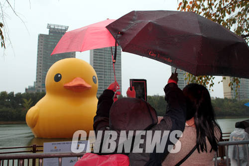 21일 정오 서울 송파구 석촌 호수에 관람객들이 비가 오는 가운데 러버덕을 촬영하고 있다.