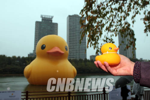 ▲21일 정오 서울 송파구 석촌호수에 떠 있는 러버덕과 한정판 러버덕 피규어.(사진=왕진오 기자)
