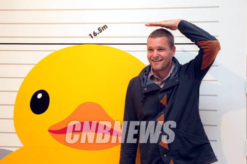 ▲21일 서울 송파구 잠실 롯데월드몰 에비뉴엘에서 '러버덕 프로젝트, 서울' 기자설명회가 열렸다. 이날 함께한 러버덕 작가 플로렌타인 호프만이 러버덕의 크기를 익살스럽게 표현하고 있다.(사진=왕진오 기자)