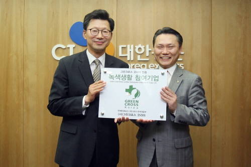 ▲CJ대한통운이 국제 환경단체인 그린크로스 코리아가 선정하는 ‘녹색생활 참여기업’에 선정됐다. 신동휘 CJ대한통운 전략지원실장(부사장)이 문귀호 그린크로스 코리아 사무국장(오른쪽)과 현판식 행사에서 기념촬영을 하고 있다.(사진제공=CJ대한통운)