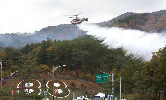 ▲인제군, 남면 관대리 소재 38대교 인근에 발생한 산불이 중형 산불로 확산이 우려되는 상황을 가정해 실전 대응능력을 갖도록 훈련 중이다.(사진제공=인제군)