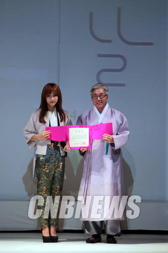 ▲25일 오후 5시서울 문화역서울 284에서 열린 '2014 한복의 날' 행사에서 김종덕 문화체육관광부 장관이 한복 홍보대사로 위촉된 배우 이유리에게 위촉장을 수여하고 있다.(사진=왕진오 기자)