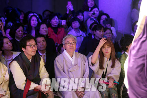 ▲25일 오후 서울 문화역서울 284에서 '2014 한복의 날' 행사가 열렸다. 행사 후 진행된 패션쇼를 관람하고 있는 김종덕 문체부 장관과 배우 이유리.(사진=왕진오 기자)