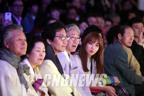행사 후 진행된 패션쇼를 관람하고 있는 김종덕 문체부 장관이 한복의 불편함을 개선하고 일상생활 속에서도 입을 수 있는 '신(新)한복'을 보고 감탄하고 있다.