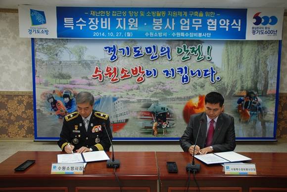 수원소방서(서장 오병민)는 27일 소방서 2층 소회의실에서 수원특수장비봉사단과 각종 재난현장 특수장비 지원과자원봉사활동을 통한 안전문화 확산을 위해 업무협약을 체결하였다.