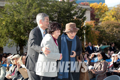 이날 자리를 함께한 나선화 문화재청장이 배우 박정자와 반갑게 인사를 나누고 있다.