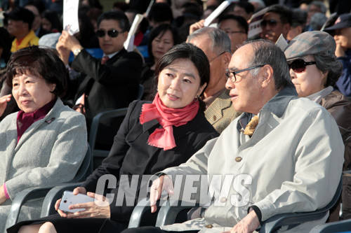 ▲27일 오후 서울 덕수궁 중화전 일곽에서 2014년 문화유산국민신탁 회원의 날 행사가 열렸다. 이날 자리를 함께한 김행 한국양성평등교육진흥원장(좌측)과 이홍구 전 국무총리(우측)가 대화를 나누고 있다.(사진=왕진오 기자)