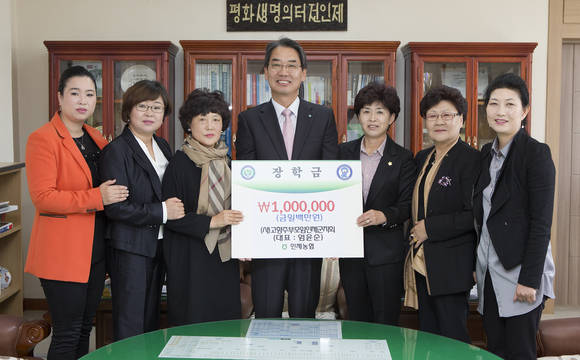 ▲▲인제농협 (사)고향주부모임 인제군 지회(대표 엄윤순)는 27일 인제군청을 방문해 장학금 100만 원을 전달했다. (사진제공=인제군)