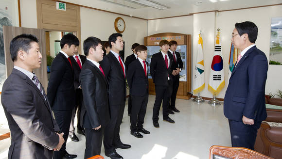 인제군청 검도부는 28일 오전 9시 40분께 군수 집무실에서 이달 28일부터 내달 3일까지 제주도에서 열리는 제95회 전국체육대회 승리를 다짐하는 출전 신고식을 가졌다.