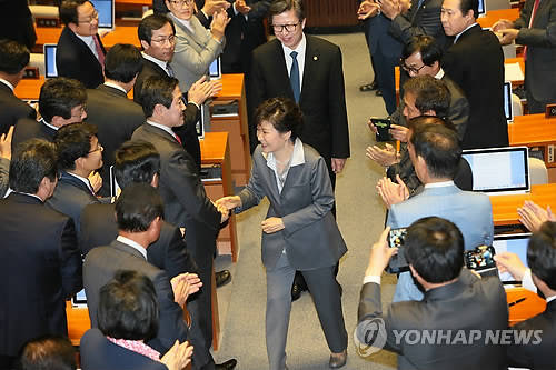▲박근혜 대통령이 29일 국회에서 새해 예산안 시정연설을 마친 뒤 의원들과 인사하며 퇴장하고 있다.(사진=연합뉴스)