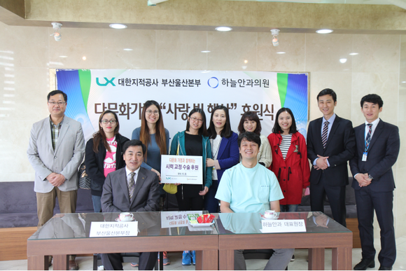 LX대한지적공사 부산울산본부(본부장 홍용성)는 하늘안과의원과 29일 결혼이주민 5명에 대한 시력교정 수술을 후원하는 행사를 갖고, 후원금 200만원을 전달했다.