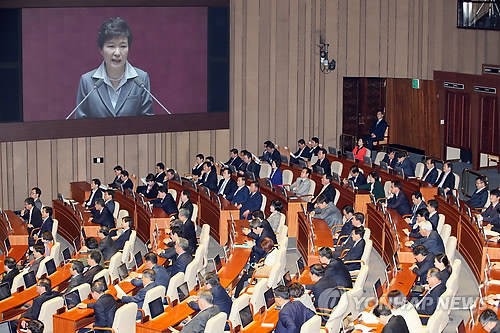 ▲박근혜 대통령이 29일 국회에서 새해 예산안 시정연설을 하고 있다.(사진=연합뉴스)