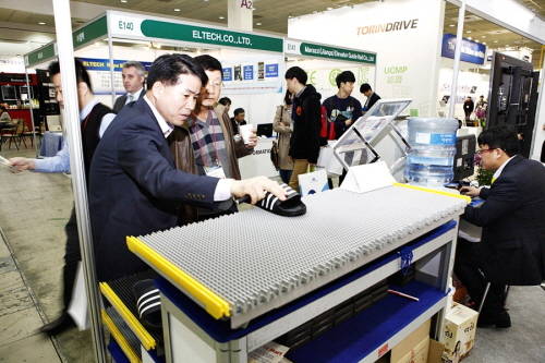▲지난 29일 2014한국 국제 승강기 엑스포에서 장호근 롯데마트 안전환경팀장(사진 왼쪽)이 관람객들에게 무빙워크 미끄럼 방지 특허기술에 대해 설명하고 있다.(사진제공=롯데마트)
