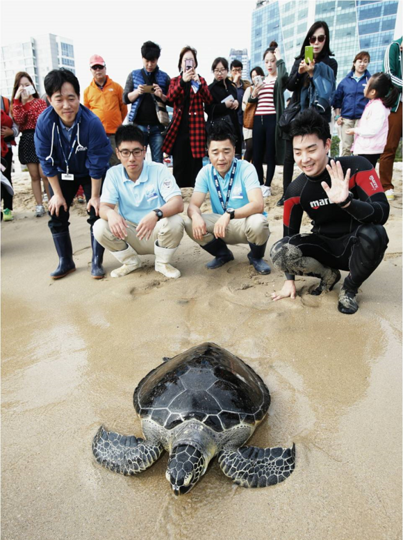 SEA LIFE 부산아쿠아리움(대표 김영필)은 지난 18일과 19일, 각각 경남 통영 욕지도와 부산 송정 앞바다에서 인근 주민의 신고를 접수받고 출동해 구조된 두 마리 푸른바다거북 중, 빠르게 건강상태가 호전된 한 마리의 푸른바다거북을 30일 해운대 앞바다에서 무사히 자연으로 돌려보냈다고 1일 밝혔다.