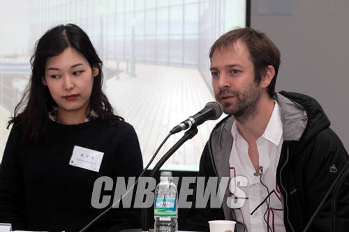 ▲3일 정오 서울 소격동 국립현대미술관 서울관에서 '박스 프로젝트 2014:레안드로 에를리치'전 설명회가 열렸다.이날 자리를 함께한 아르헨티나 출신 작가 레안드로 에를리치(41)가 서울관에 설치한 '대척점의 항구' 작업에 대해 설명하고 있다.(사진=왕진오 기자)