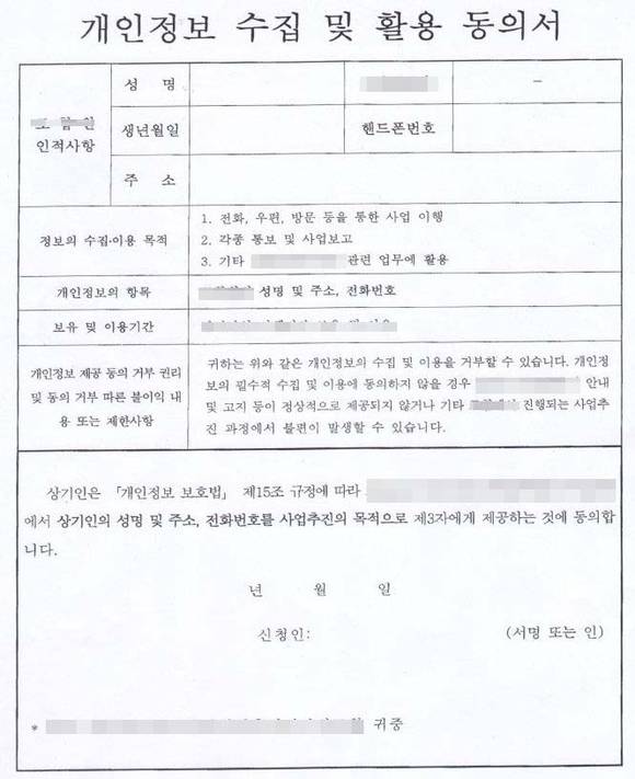▲개인정보보호법에 따르면, 홈플러스가 경품행사 응모 고객의 동의를 받은 경우, 개인정보를 수집할 수 있으며 수집 목적의 범위 내에서 활용할 수 있다. 따라서 홈플러스의 위법성 여부를 가리기가 쉽지 않은 상황이다. 사진은 일상에서 주로 사용되는 개인정보수집활용 동의서 양식. 홈플러스는 응모권 뒷면에 이와 비슷한 양식의 동의서를 만들어 고객들이 기재하도록 했다.
