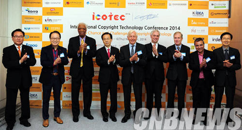 ▲5일 서울 여의도 63빌딩 컨벤션센터에서 급변하는 디지털 시대에 저작권 기술에 대한 인식을 제고하고 저작권 기술을 재조명하는 ‘국제 저작권기술 콘퍼런스(ICOTEC) 2014’ 행사가 ‘저작권기술의 새로운 도전과 기회’라는 주제로 열렸다. 이날 김희범 문화체육관광부 제1차관, 오승종 한국저작권위원회 위원장, 이상벽 한국저작권단체연합회 이사장 등 이번 행사에 참여한 발표자들과 함께 행사에 앞서 기념촬영을 하고 있다. (사진=문화체육관광부)