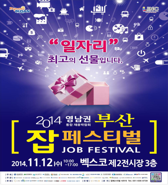 부산시와 부산고용노동청, 부산울산중소기업청, 부산경영자총협회, 부산상공회의소 등 20여 개의 유관기관과 부산권LINC사업단이 협력해 공동으로 주최하는 이번 잡 페스티벌은 취업을 희망하는 영남권 모든 구직자들을 대상으로 진행된다.