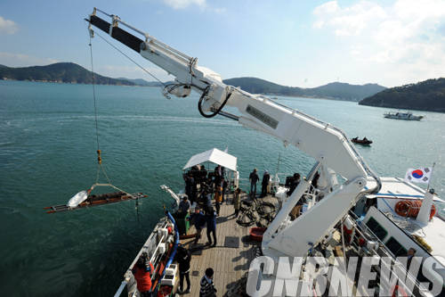 ▲5일 오후 태안 마도 인근 해역에서 국립해양문화재연구소가 조선시대 고선박으로 추정되는 '마도 4호선'의 '목재 닻'을 인양하고 있다.(사진=문화재청)