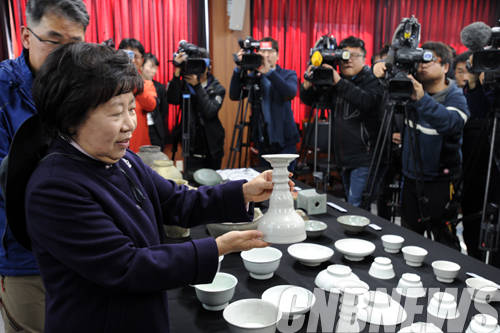 ▲5일 충청남도 태안 마도 해역에서 조선시대 것으로 추정되는 선박이 추가로 발견됐다. 이날 진행된 기자브리핑 현장을 찾은 나선화 문화재청장이 발굴된 백자를 설명하고 있다.(사진=문화재청)