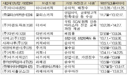 이디야(브랜드명: 이디야커피), 사과나무(커피베이), 커피니(커피니), 블루빈커피컴퍼니(라떼킹), 제이지이커피컴퍼니(모노레일에스프레소), 리치홀딩스(라떼야커피), 티에고(커피마마), 태영에프앤비(주커피), 버즈커피(버즈커피), 할리스에프앤비(할리스커피) 등은 객관적 근거 없이 수익률이 높거나 창업비용이 낮은 것처럼 홍보했다.