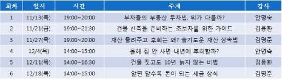 이번 행사는 ‘내가 만든 부자, 나를 만든 부자’라는 주제로 우리은행 부동산 및 세무 전문가들이 재능기부 차원에서 마련한 무료 세미나다. 합리적인 부동산 투자법과 2015년 부동산 시장 전망, 건물 신축 초보자를 위한 가이드, 슬기로운 재산 상속법 및 돈 되는 세금상식 등을 6회에 걸쳐 소개한다.