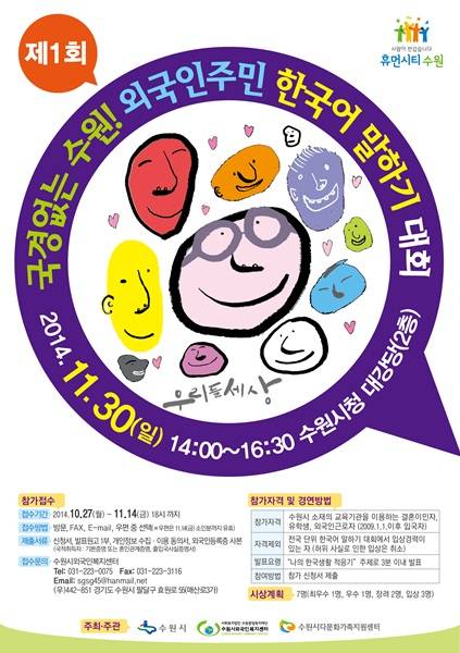 수원시가 주최하고 수원시외국인복지센터, 수원시다문화가족지원센터가 주관하는 이번 대회는 아주대학교어학당, 수원YWCA 등 외국인 관련기관들이 참여해 기념행사와 초청공연, 한국어 말하기 본선 대회가 펼쳐진다.