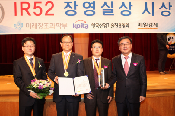 ▲지난 5일 열린 2014년 ‘IR52 장영실상’ 시상식에서 (왼쪽부터) 대우조선해양 우제혁 수석위원, 권오익 상무, 심인환 차장, 이성근 전무가 기념촬영을 하고 있다. (사진제공=대우조선해양)