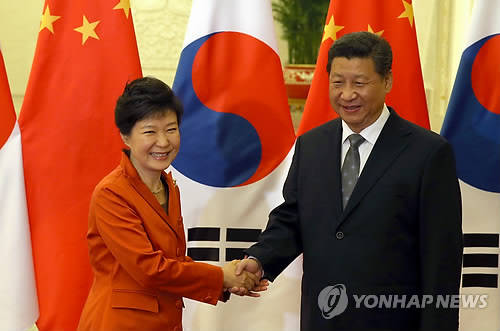 박근혜 대통령과 시진핑 중국 국가주석이 10일 오전 베이징 인민대회당에서 열린 한-중 정상회담에서 밝은 표정으로 악수하고 있다.