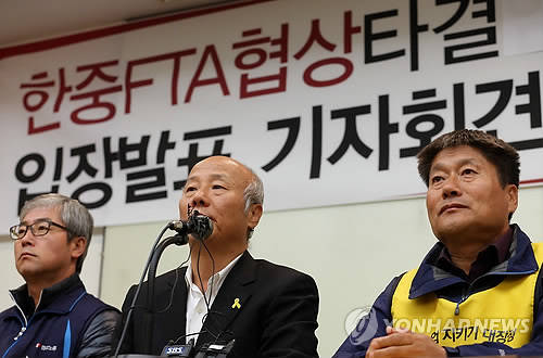 한국과 중국 간 FTA(자유무역협정)가 타결된 10일 오전 서울 중구 프란치스코회관에서 박석운 FTA대응 범국민대책위(범대위) 대표(가운데)가 기자회견을 열고 규탄발언을 하고 있다.