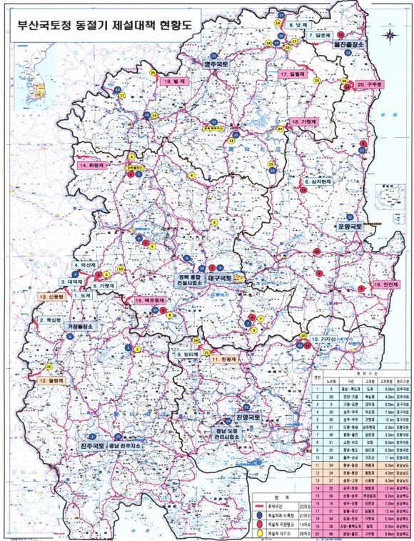 또한 부산국토청은 국도 26호선 전북 장수군과 경남 함양군 사이에 위치한 육십령 등 20여곳을 폭설 취약구간으로 선정하고 제설장비와 작업인원을 상시 배치키로 했다.