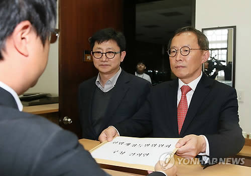 ▲10일 국회 의안과에서 새정치민주연합 우윤근 원내대표실의 김영근 비서실장(오른쪽)이 여야 의원들로 구성된 '개헌추진 국회의원 모임'의 '헌법개정특별위원회 구성 결의안'을 제출하고 있다. (사진=연합뉴스)