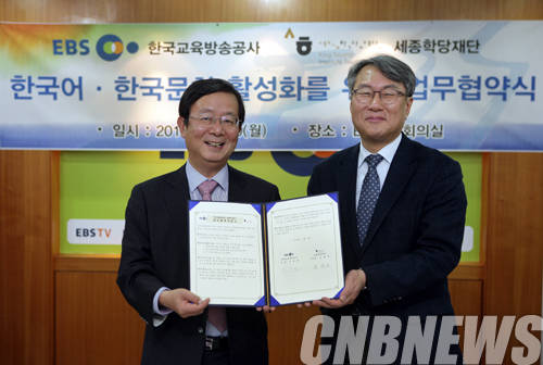 ▲10일 오후 EBS-세종학당 업무협약식, 좌측부터 EBS 신용섭 사장, 세종학당재단 송향근 이사장.