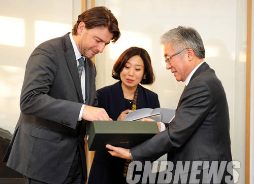 ▲김종덕 문화체육관광부 장관이 10일 서울 국립현대미술관 서울관 접견실에서 다르코 로렌친(Darko Lorencin) 크로아티아 관광부 장관을 만나 우리나라 전통공예품인 필함을 선물 하고 있다.(사진=문화체육관광부)
