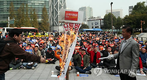 ▲30일 오후 서울 보신각 앞에서 전국이동통신유통협회의 단통법 폐지 결의대회가 열리고 있다(사진: 연합뉴스)