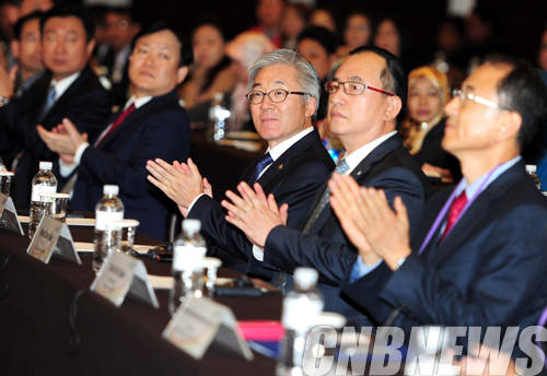 ▲11일 서울 웨스턴 조선호텔에서 ‘2014 문화·관광의 창조적 브랜드 구축 포럼’이 열렸다. 이날 김종덕 문화체육관광부 장관이 변추석 한국관광공사 사장과 함께 포럼 축하 박수를 치고 있다. (사진=문화체육관광부)