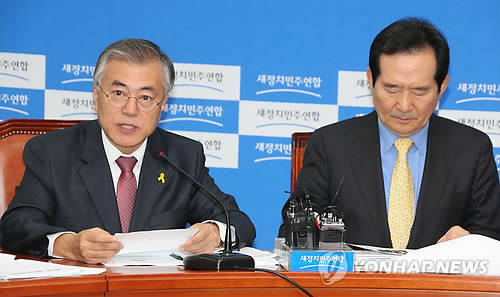 ▲새정치민주연합 비상대책회의에서 문재인 비대위원(왼쪽)이 모두발언을 하고 있는 가운데 정세균 비대위원이 자료를 살펴보고 있다. (자료사진=연합뉴스)