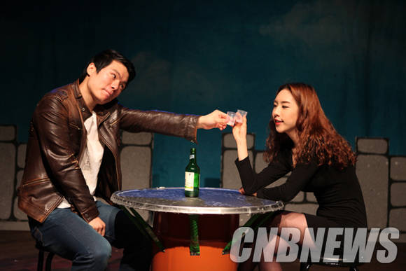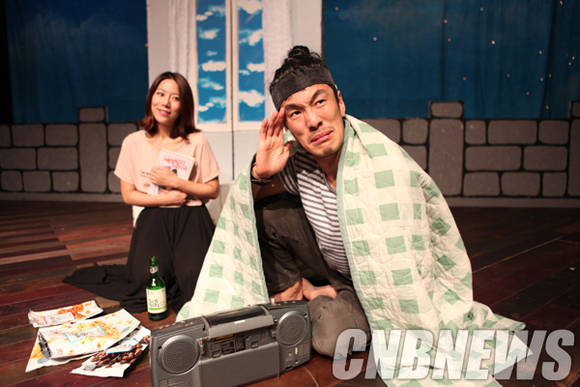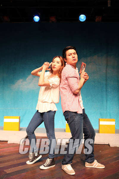 ▲연극 '애정빙자사기극'에서 '승배' 역을 맡은 배우 황영준과 '아름' 역을 맡은 배우 황희정이 호흡을 맞추고 있다.(사진제공=여우별컴퍼니)